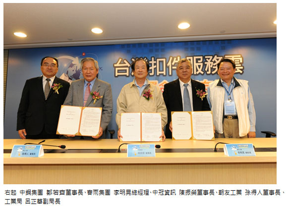 国内首创的「台湾扣件服务云」,于2014年12月25日假中钢集团总部大楼盛大举办启动记者会,特别邀请产业代表春雨集团总经理李明晃、朝友工业董事长孙得人莅临与中冠资讯董事长陈振荣签属合作意向书。中钢董事长邹若齐、经济部工业局副局长吕正华、中山大学校长杨弘敦、台湾螺丝公会理事长张土火、台湾螺丝贸易协会秘书长项大勇、工业局电子信息组专门委员谢戎峰等亦出席,共同见证扣件产业迈入崭新面貌的历史性一刻。